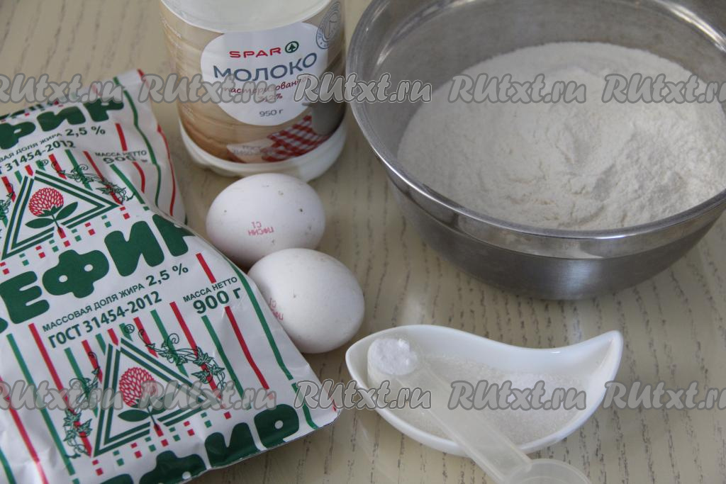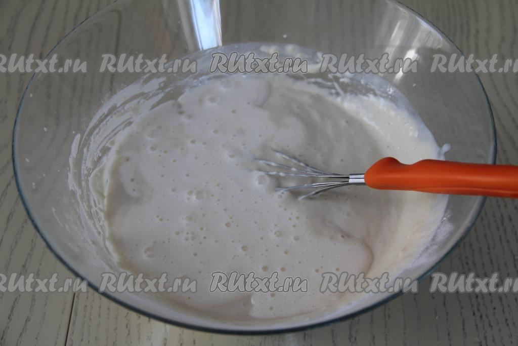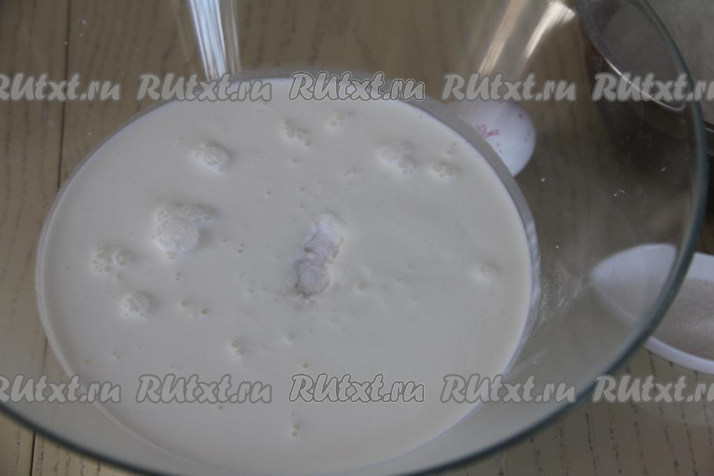 В объёмную миску влить кефир, всыпать соду, очень хорошо перемешать, оставить на 4-5 минут. Сода за это время погасится и поверхность кефира запенится.