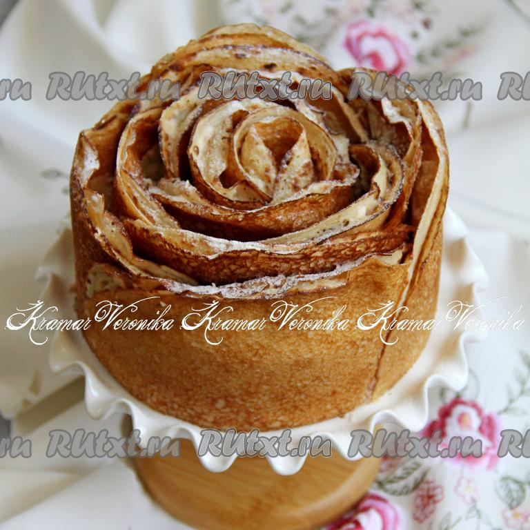 К семейному чаепитию предлагаю приготовить красивый, вкусный блинный торт в виде розы с заварным кремом. Тесто для блинов замешивается на молоке и кефире, блинчики получаются очень аппетитными, хорошо сворачиваются. Сформировать такой торт несложно, главное - дать ему хорошо стабилизироваться в кулинарном кольце. Блинный торт "Роза" очень хорошо смотрится и целиком, и в разрезе. Такой торт даже не требует дополнительного украшения. Просто, красиво и вкусно, обязательно приготовьте такой блинный тортик для себя и своих близких!