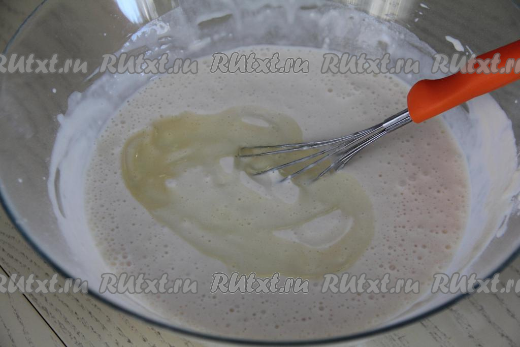 Влить в блинное тесто растительное масло, снова перемешать до однородности. Оставить тесто "отдохнуть" минут на 7-10. Блинное тесто должно получиться не густым, но и слишком жидким оно быть не должно.