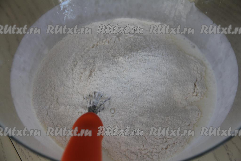 В запенившуюся смесь кефира и соды всыпать муку, соль и сахар, перемешать венчиком.