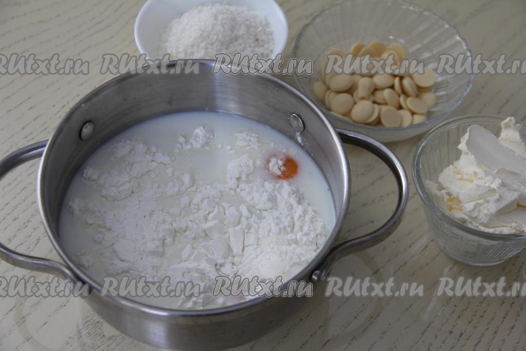 Влить в кастрюлю с толстым дном молоко, добавить желтки, крахмал и сахар, перемешать массу венчиком до однородности и поставить на средний огонь.