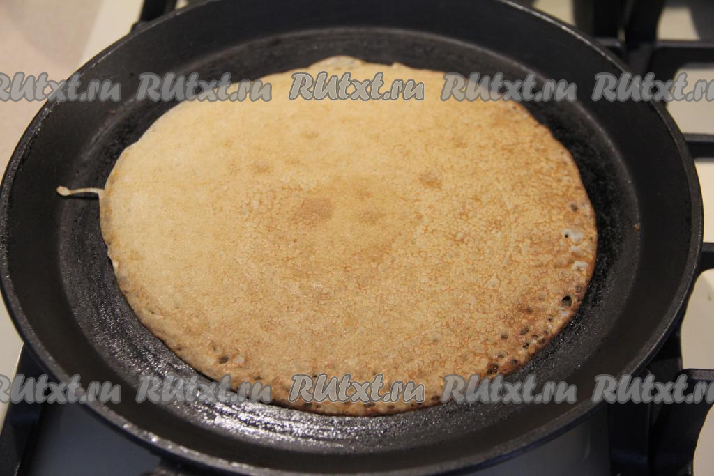 Сковороду диаметром 20 сантиметров немного смазать растительным маслом, хорошо прогреть, влить половник теста. Тесто равномерно распределить по дну сковородки и жарить блин на среднем огне до подрумянивания с двух сторон. Готовый аппетитный блинчик переложить со сковороды на тарелку. Периодически перемешивая тесто и смазывая сковороду только по мере необходимости, постепенно пожарить все блины (у меня обычно получается 23-25 штук), складывая их стопкой на тарелку.