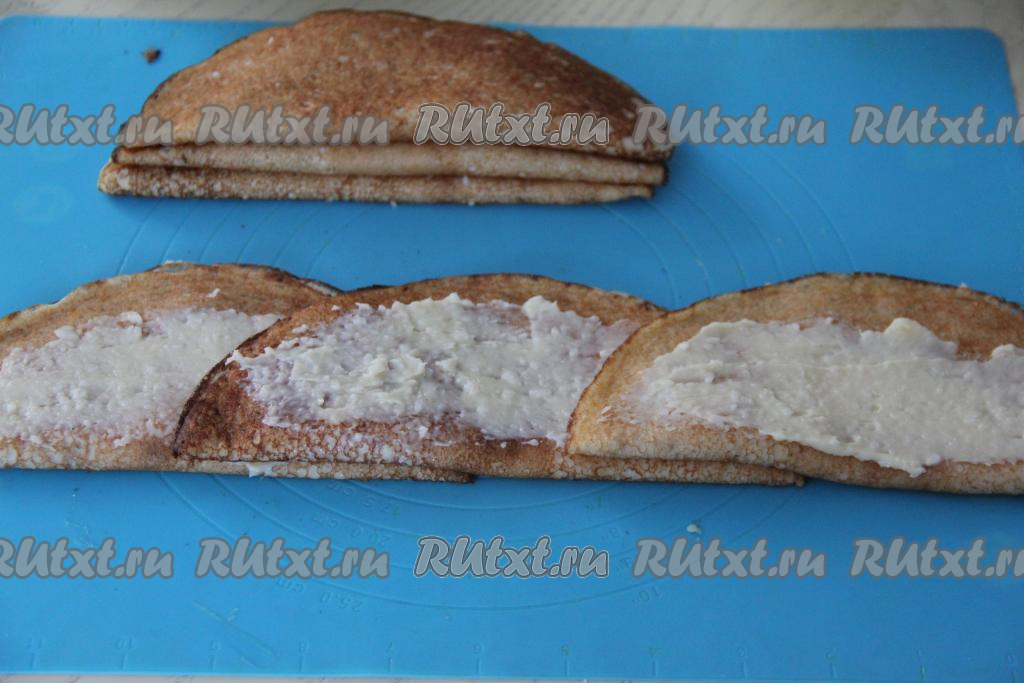 На плоскую поверхность выложить первый блин, сложенный пополам, смазать его сверху частью крема, немного отступив от краёв. На этот блин внахлёст выложить следующий блин, тоже смазать его сверху частью крема, выложить третий блинчик внахлёст, тоже смазать частью крема. Получится полоска из трёх блинов, как на фото.