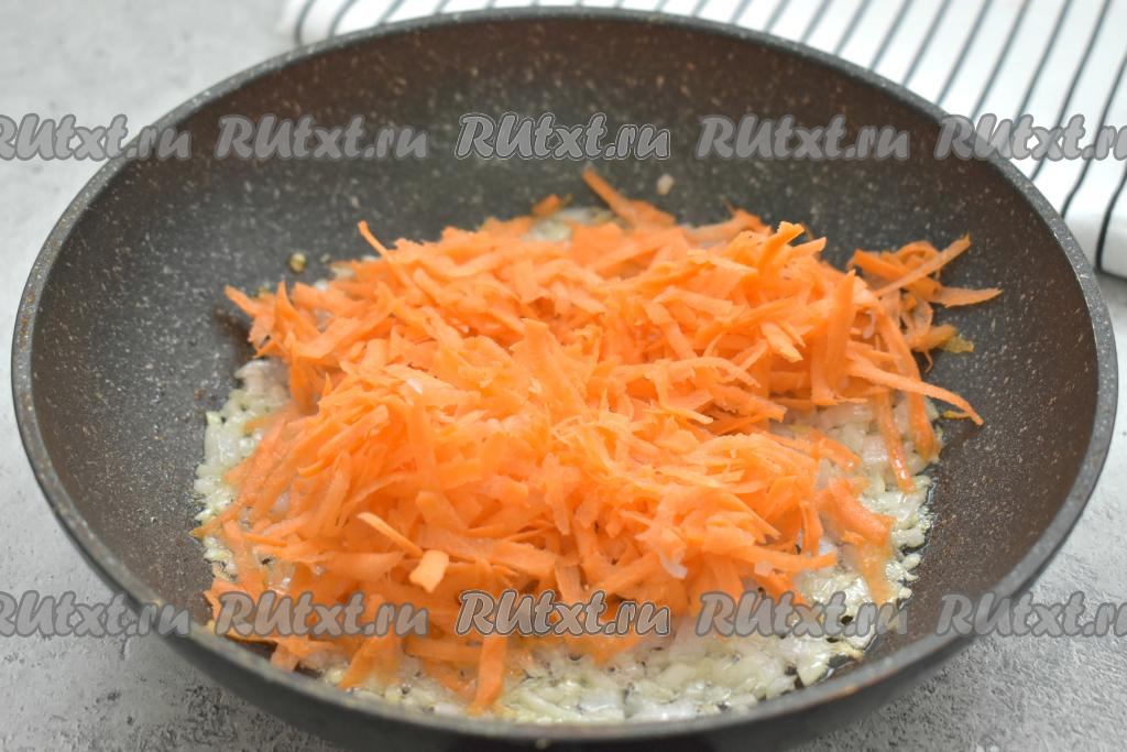 К обжаренному луку добавляем натёртую на крупной тёрке морковь, перемешиваем и обжариваем овощи 4-5 минут (до мягкости морковки), периодически перемешивая.