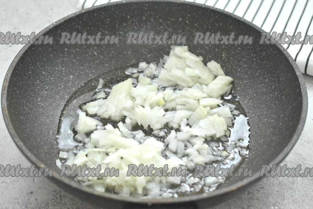 Очищаем морковку и лук. Разогреваем на сковороде растительное масло, выкладываем мелко нарезанный лук и обжариваем его на среднем огне до прозрачности (ориентировочно в течение 3-4 минут), иногда помешивая.