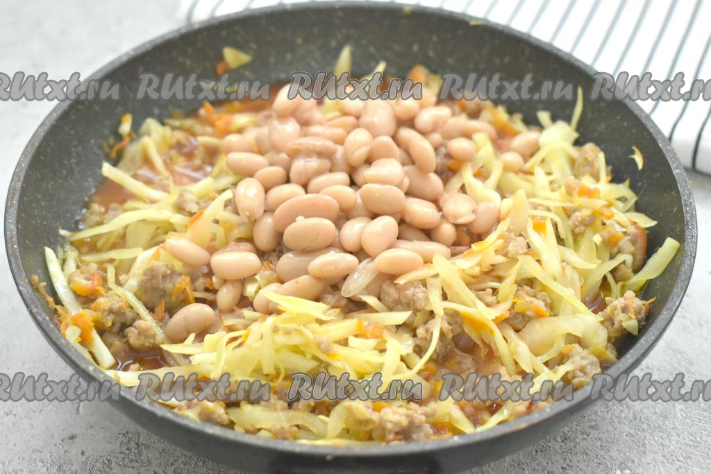 Консервированную фасоль заранее откидываем на дуршлаг, ополаскиваем холодной водой, лишней воде даём стечь. Фасоль добавляем в сковороду сразу за томатным соусом, перемешиваем. Сковороду накрываем крышкой, даём соусу закипеть и, убавив огонь, тушим капусту с фаршем и фасолью 20-25 минут (до мягкости капусты), периодически перемешиваем.
