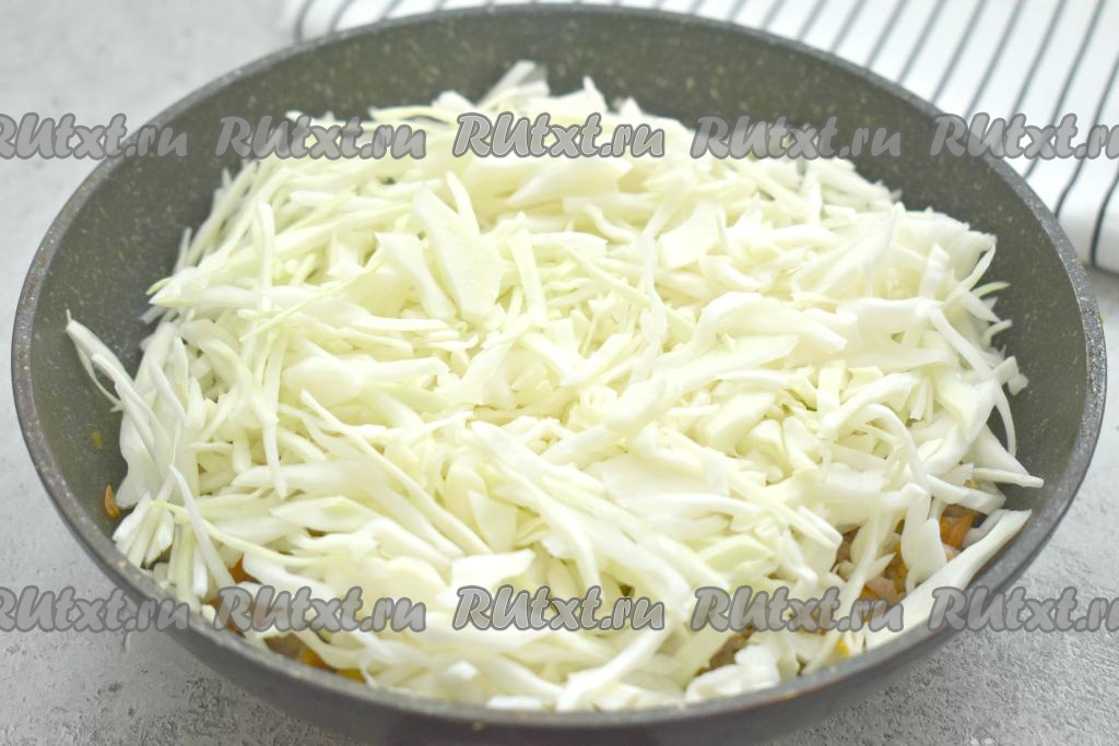 Затем выкладываем в сковороду капусту, нарезанную на тонкие полоски, перемешиваем и обжариваем 7-8 минут.