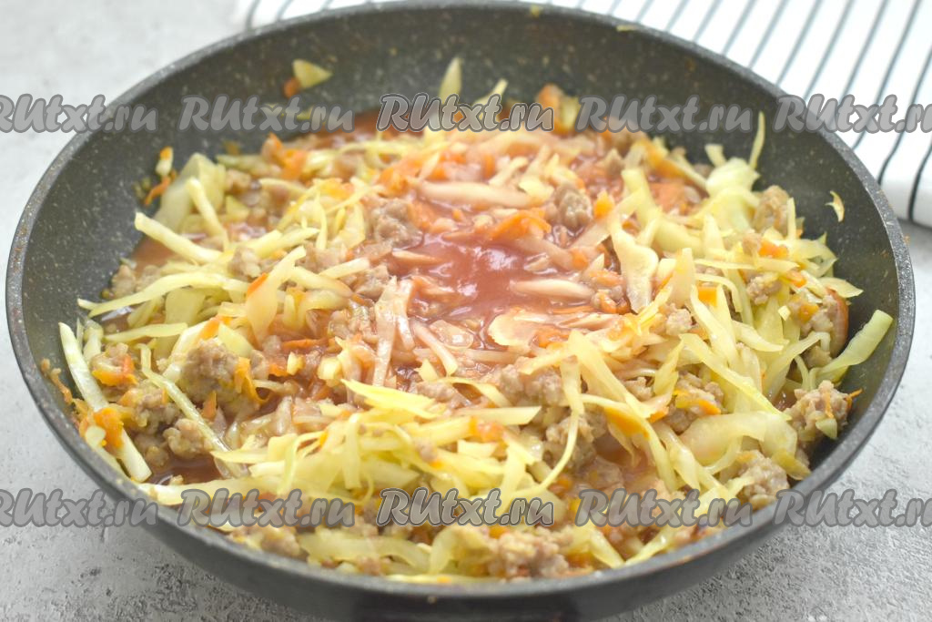 В отдельной ёмкости смешиваем томатную пасту с 300 миллилитрами тёплой кипячёной воды до однородности. После того как фарш с капустой обжарится в течение 7-8 минут, добавляем в сковороду получившийся томатный соус.