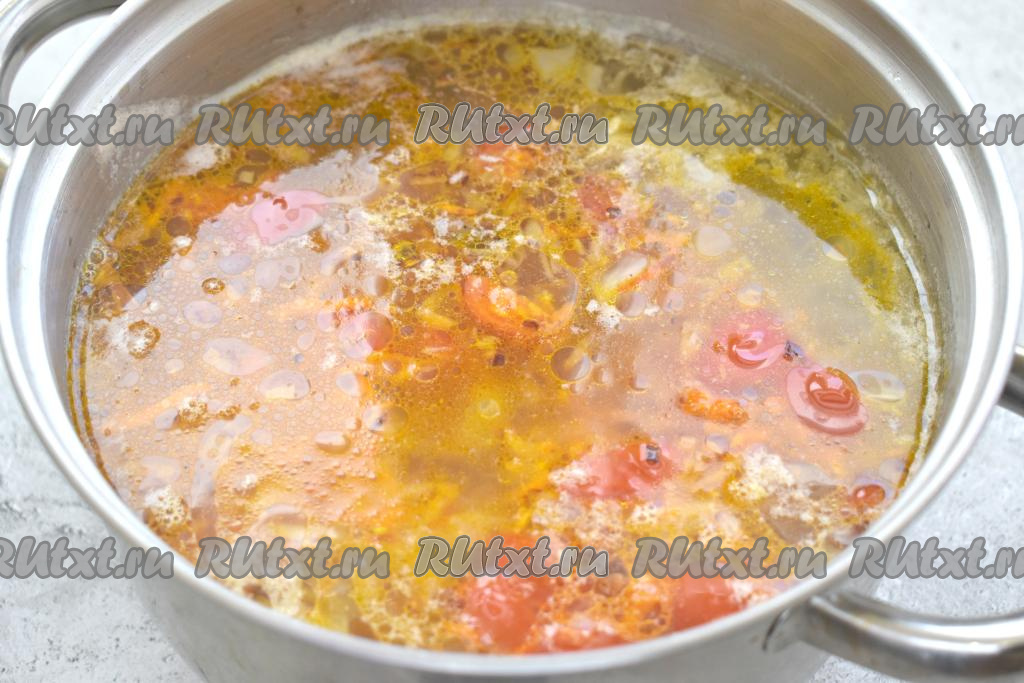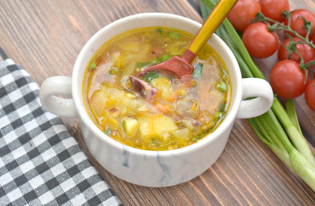 После того как капуста с картошкой проварятся минут 20-25, добавляем в кастрюлю овощи, обжаренные с копчёной курицей, даём закипеть и варим на небольшом огне 7-10 минут.