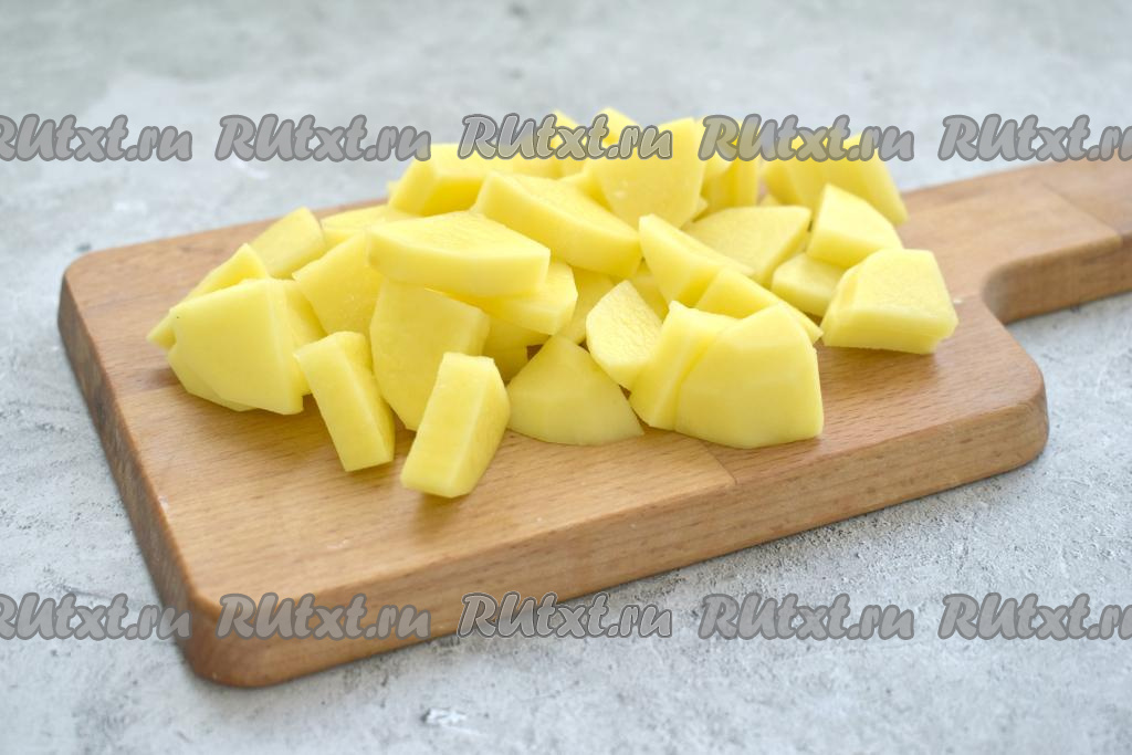 В кастрюлю вливаем 1,5-2 литра воды, ставим на огонь. Картофель очищаем, нарезаем на небольшие кусочки и выкладываем в кастрюлю с закипевшей водой.