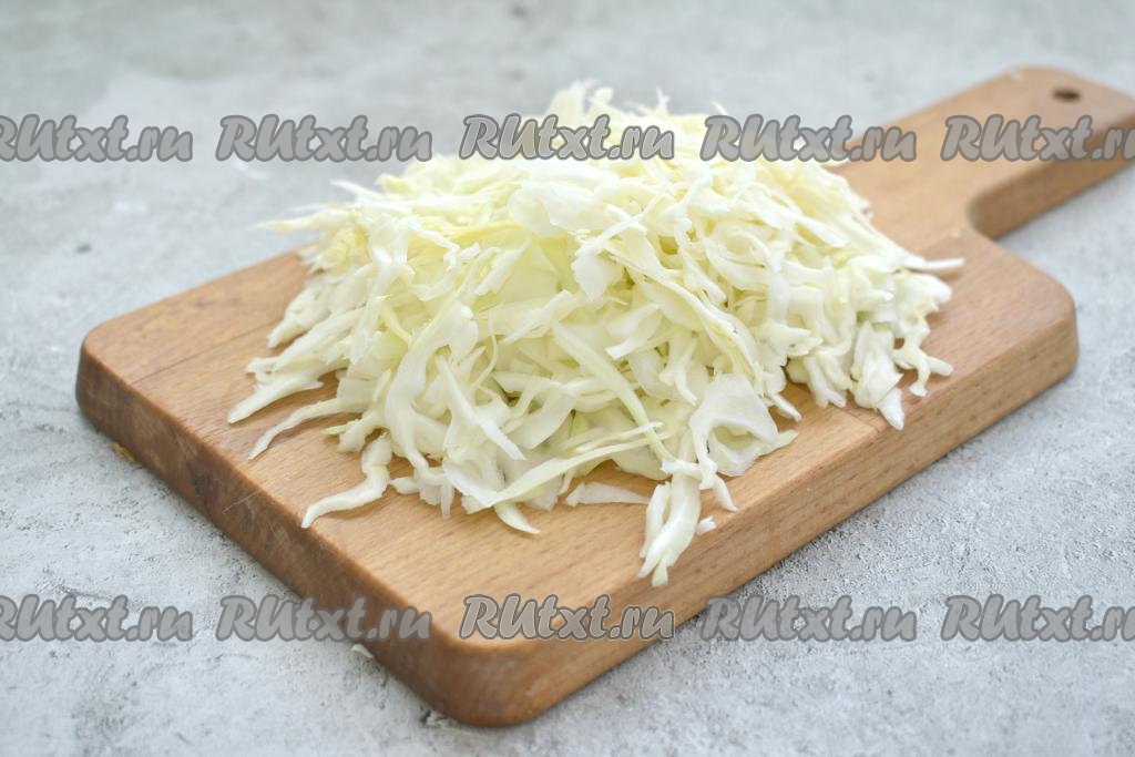 Свежую белокочанную капусту нарезаем на тонкие полоски и отправляем в кастрюлю вслед за картошкой, даём воде закипеть и, уменьшив огонь, варим овощи минут 20-25.