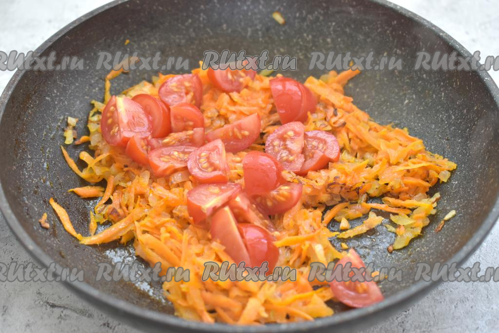 Затем к луку и моркови добавляем помидоры, нарезанные на небольшие ломтики (или кубики), перемешиваем и обжариваем минуты 2.