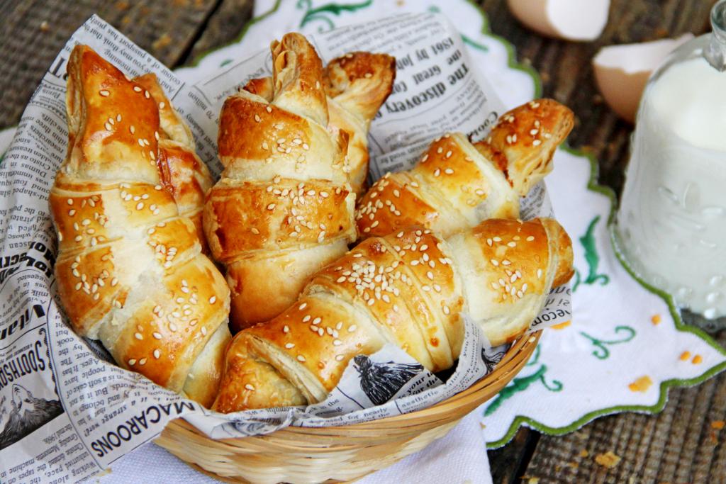 Яичный желток в небольшой ёмкости взбить до однородности вилкой. Смазать слойки взбитым желтком. По желанию, можно присыпать слойки сверху кунжутом (или маком).