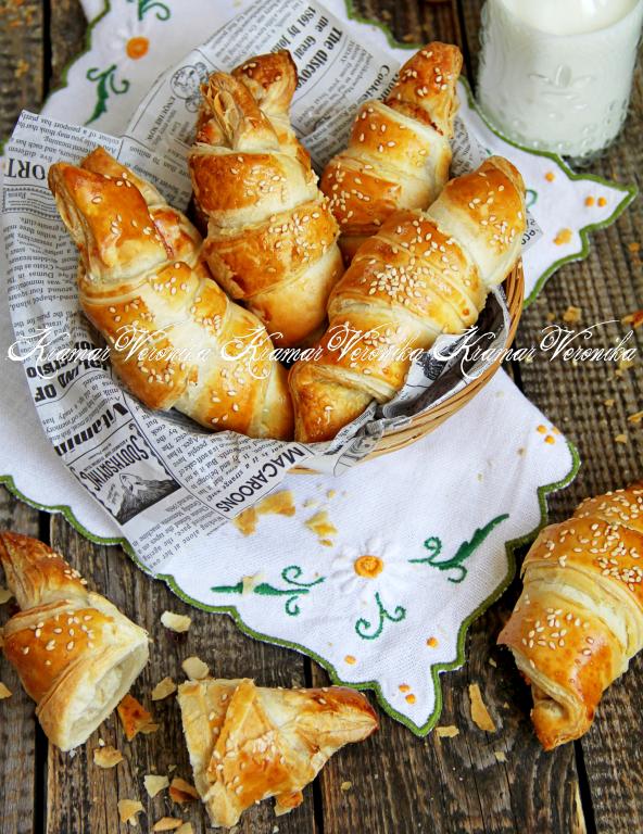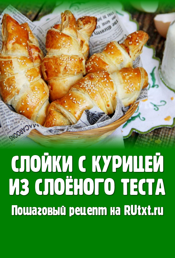 Аппетитные слойки с нежной начинкой из курицы тёплыми подать к столу.