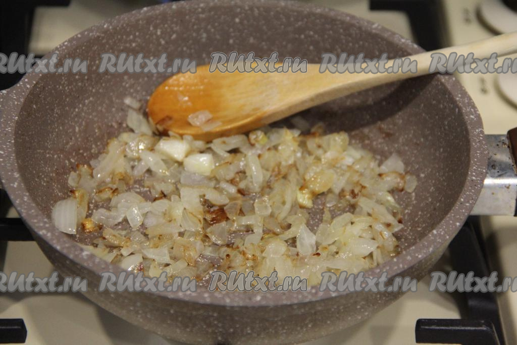 Лук почистить, мелко его нарезать и обжарить на растительном масле, периодически помешивая, до золотистого цвета.
