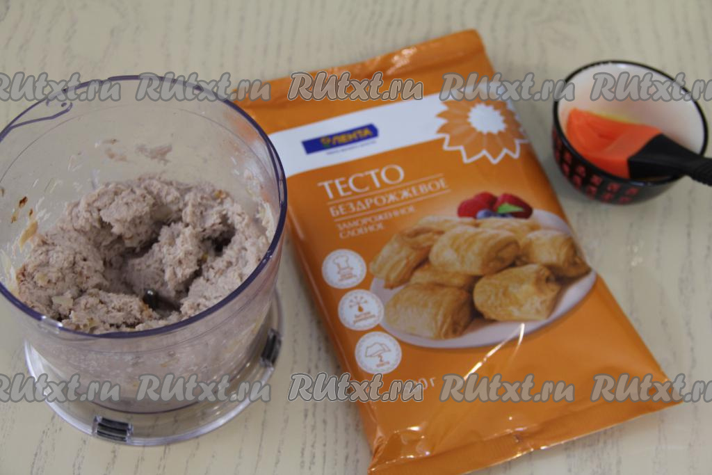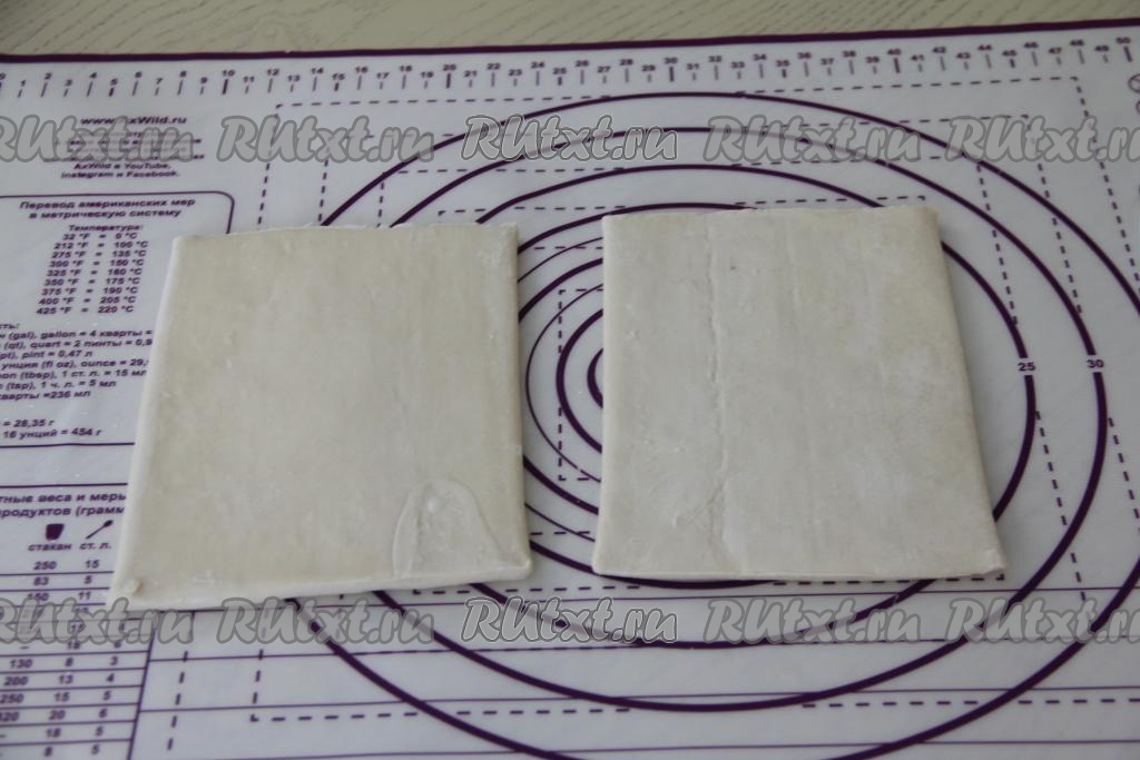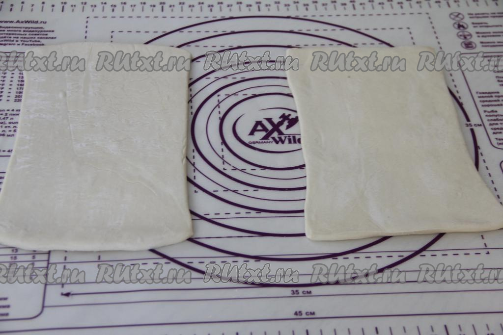 Разморозить покупное слоёное тесто при комнатной температуре. У меня тесто было в двух пластах.