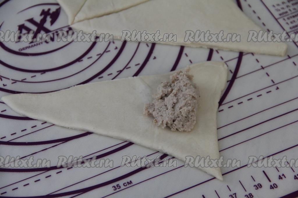 Начинку из мяса курицы и лука зрительно разделить на 8 частей (по количеству заготовок теста). Взять один треугольник из теста, ближе к основанию треугольника выложить одну часть начинки, немного отступив от краёв.