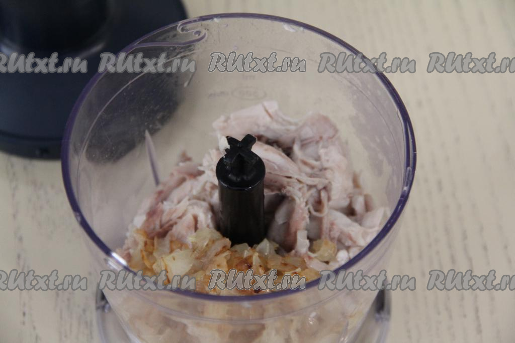 В чашу измельчителя выложить куриное мясо и жареный лук, измельчить до однородности. Если нет измельчителя, можно пробить мясо с луком до однородности погружным блендером или пропустить через мясорубку. Если нужно, подсолить курино-луковую массу и начинка для слоек готова.