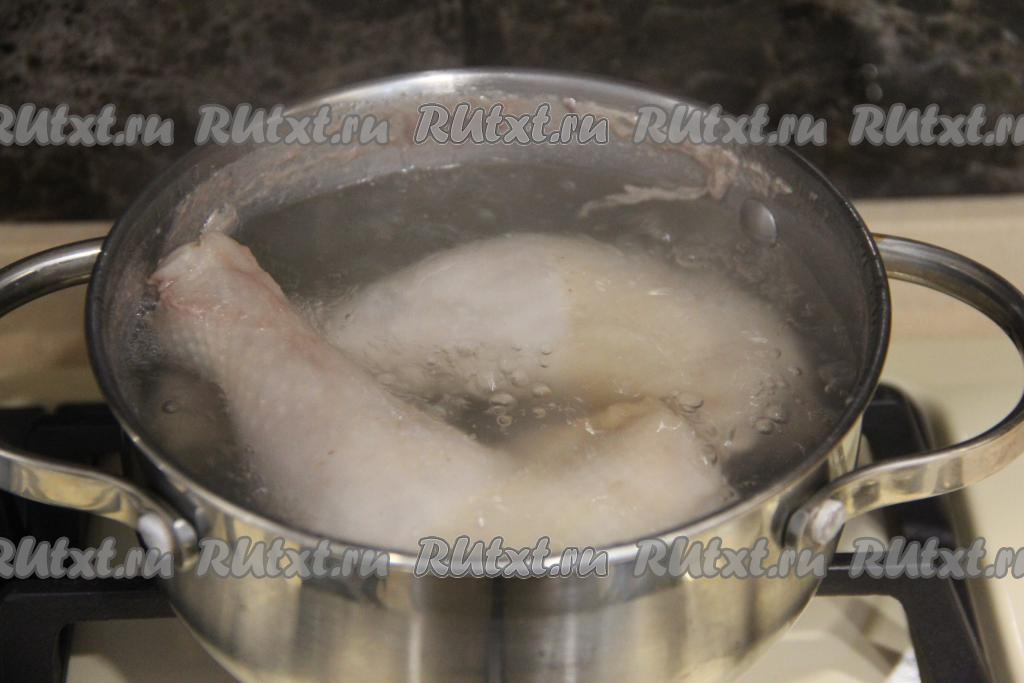 Куриное мясо (у меня - куриные ножки) вымыть, выложить в кастрюлю, залить полностью водой и поставить на огонь. После закипания, подсолив воду, варить мясо на небольшом огне в течение 30 минут, затем слегка остудить в бульоне. Отделить мясо от костей, должно получиться 300 грамм варёного куриного мяса.
