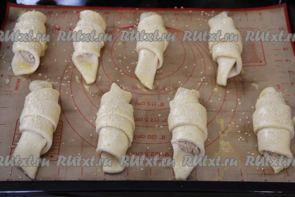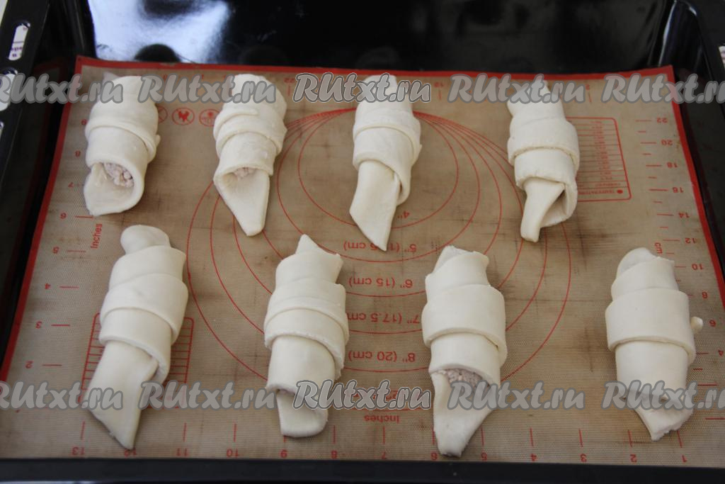Начиная со стороны с начинкой, свернуть тесто в рулетик. Выложить сформированную слойку с курицей на противень, застеленный ковриком (или бумагой) для выпечки. Аналогично сформировать и выложить на противень на расстоянии друг от друга все слойки.
