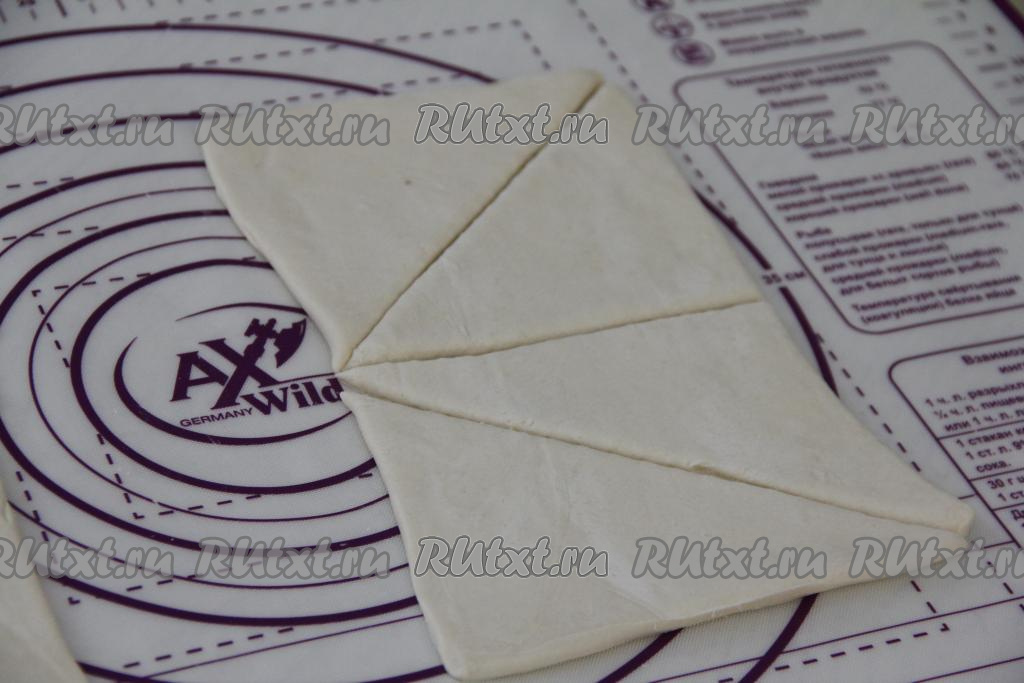 Каждый пласт теста разрезать на 4 треугольника. Из двух пластов теста у нас получатся 8 треугольных заготовок для приготовления слоек.