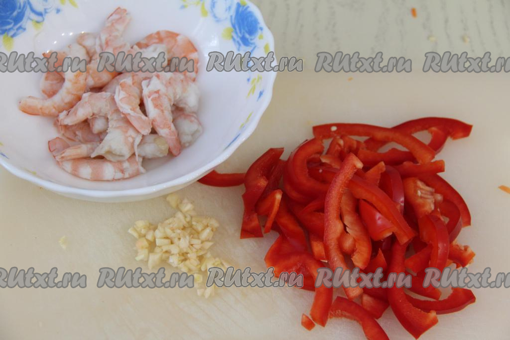 Креветки очистить от головы и панциря. Если креветки крупные, тогда нужно вынуть тонкую кишку, которая проходит поверх хвостовой части каждой креветки. Болгарский перец нарезать на длинные брусочки, чеснок - мелко.