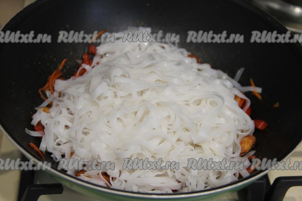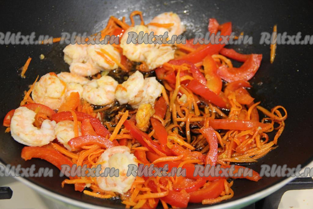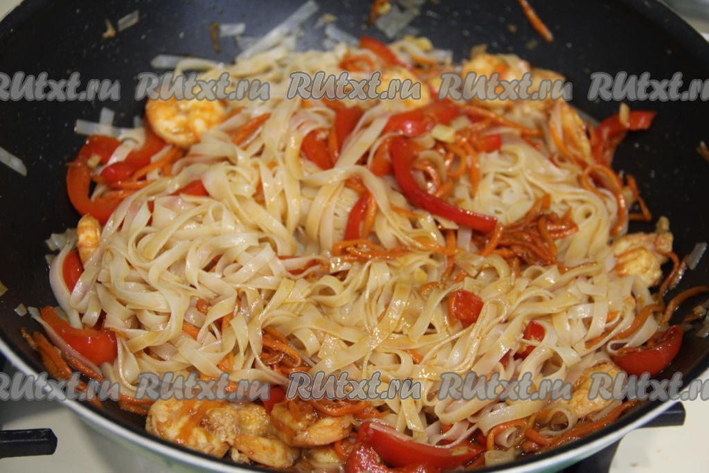 К овощам, обжаренным с креветками в соевом соусе, добавить подготовленную рисовую лапшу.