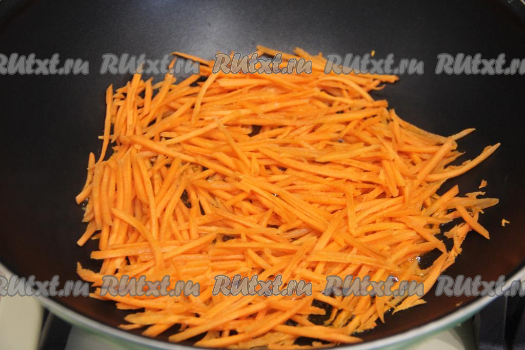 Морковь натереть на тёрке для корейской моркови (если нет такой тёрки, тогда нарежьте морковь на тонкие брусочки или натрите на крупной тёрке). Разогреть растительное масло в сковороде, выложить морковку и обжаривать её минут 5 на среднем огне, иногда помешивая.