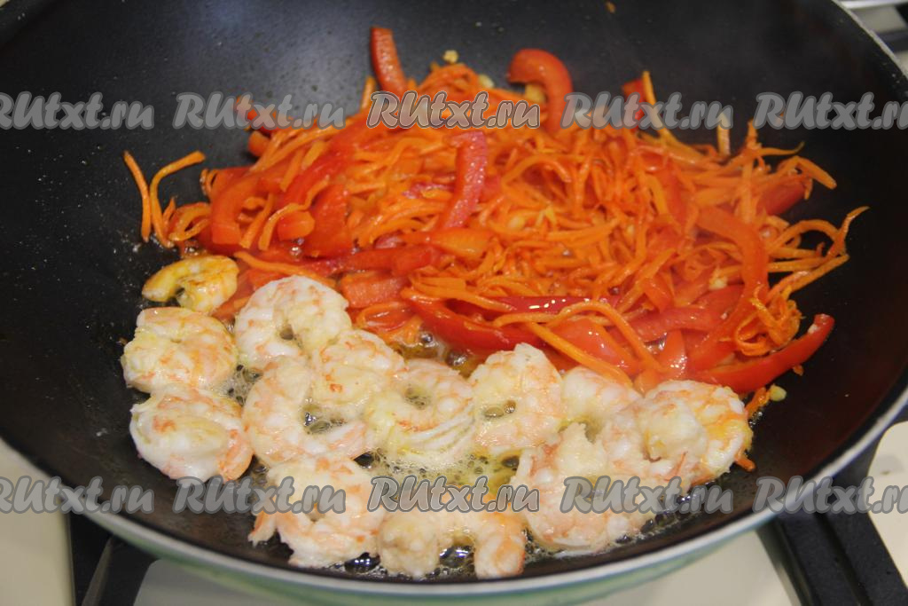Отодвинуть обжаренные овощи на одну половину сковороды. На освободившуюся половину сковороды выложить подготовленные креветки.