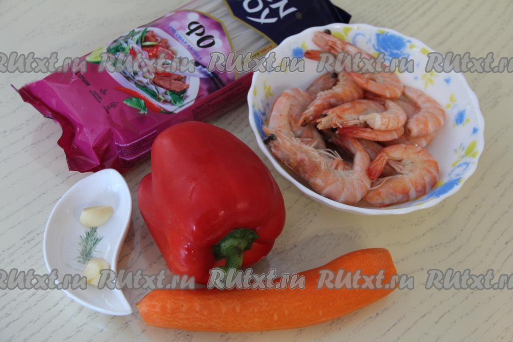 Подготовить продукты. Креветки (у меня - королевские креветки) разморозить при комнатной температуре. Морковь и зубчики чеснока очистить. Болгарский перец вымыть.