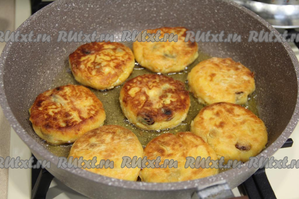 Жарить сырники на среднем огне с каждой стороны по 3-4 минуты (до золотистого цвета), затем выключить огонь, перевернуть сырники и подержать их под крышкой минут 5.