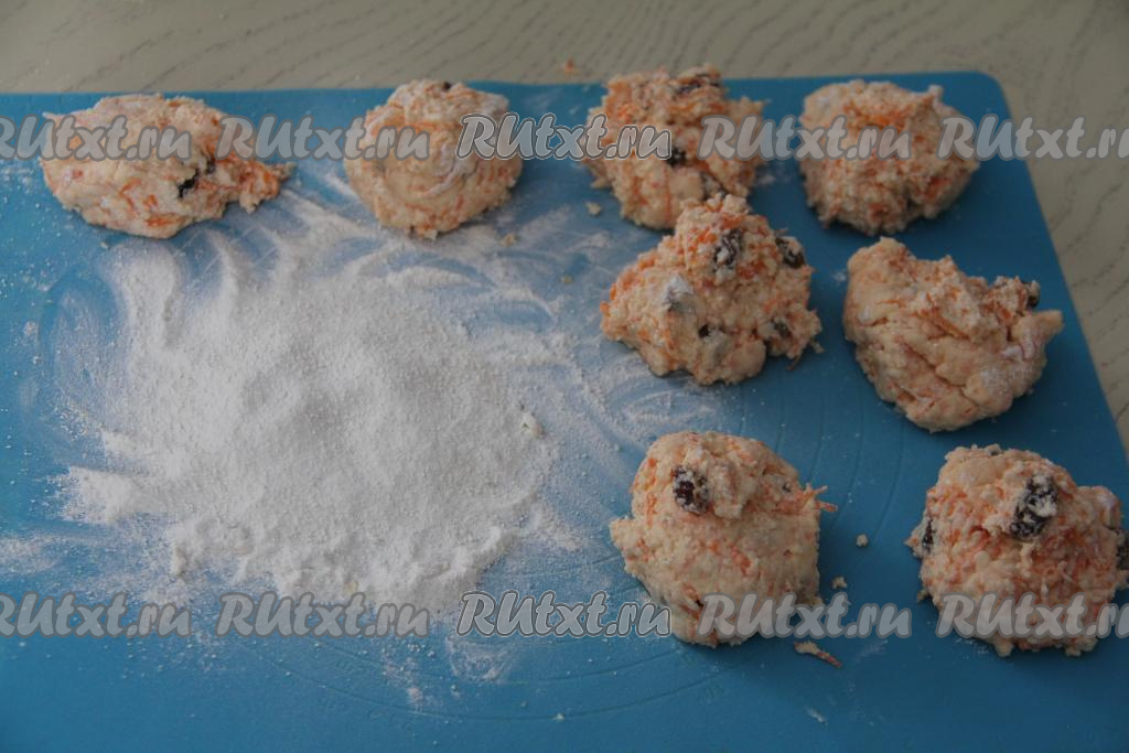 В отдельную глубокую тарелку насыпать муку, в которой будут обваливаться сырники. Влажными руками сформировать из каждой части творожного теста округлый сырник и обвалять со всех сторон в муке. В результате у нас получатся 8 заготовок сырников из творога с морковью и изюмом.