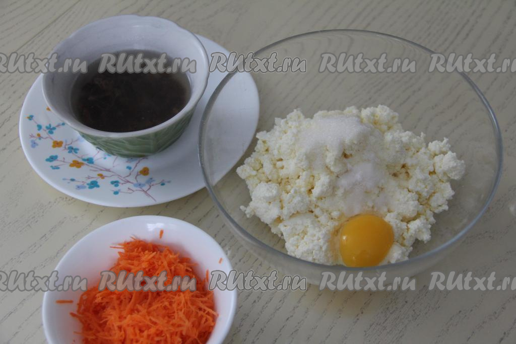 Изюм выложить в небольшую ёмкость, полностью залить его кипящей водой и оставить на 8-10 минут. Творог соединить в глубокой миске с сахаром и яйцом, перемешать творожную массу до однородности. Морковь натереть на мелкой тёрке. Если натереть морковку на обычной тёрке, она может не успеть прожариться.