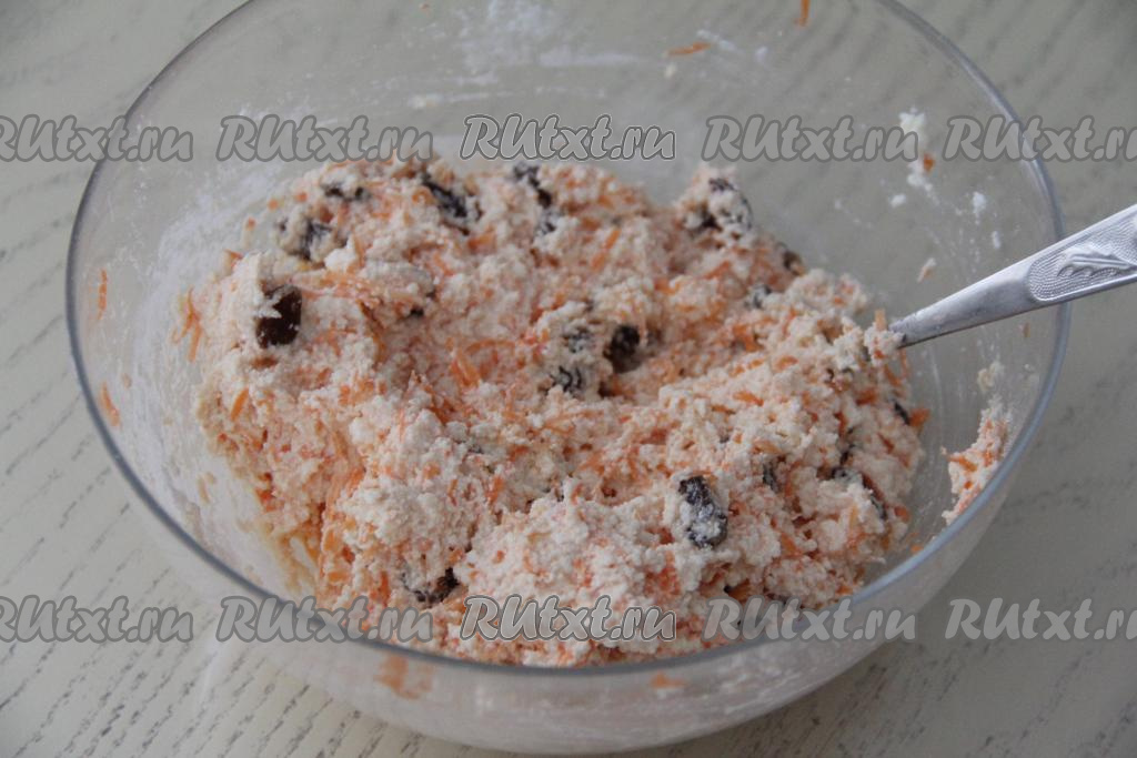 Вмешать вилкой морковку в творожную массу. Добавить обсушенный изюм.