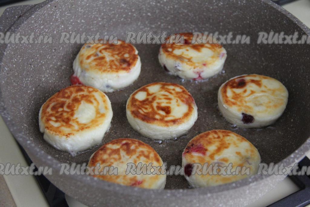 Жарить сырники с клюквой с двух сторон на среднем огне до золотистого цвета (примерно по 3-4 минуты с каждой стороны). Выключить огонь, снова перевернуть сырники, накрыть сковороду крышкой и оставить сырники пропариться на 3 минуты.