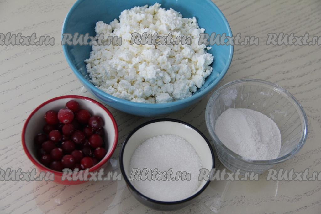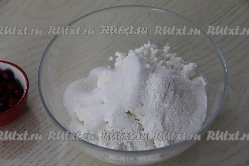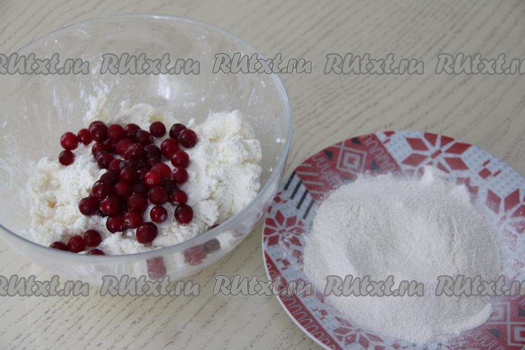 Перемешать творожную массу до однородности и добавить подготовленную клюкву.