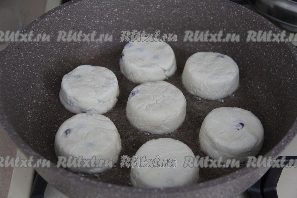 Растительное масло влить в сковороду, дать ему хорошо прогреться, а затем выложить заготовки сырников.