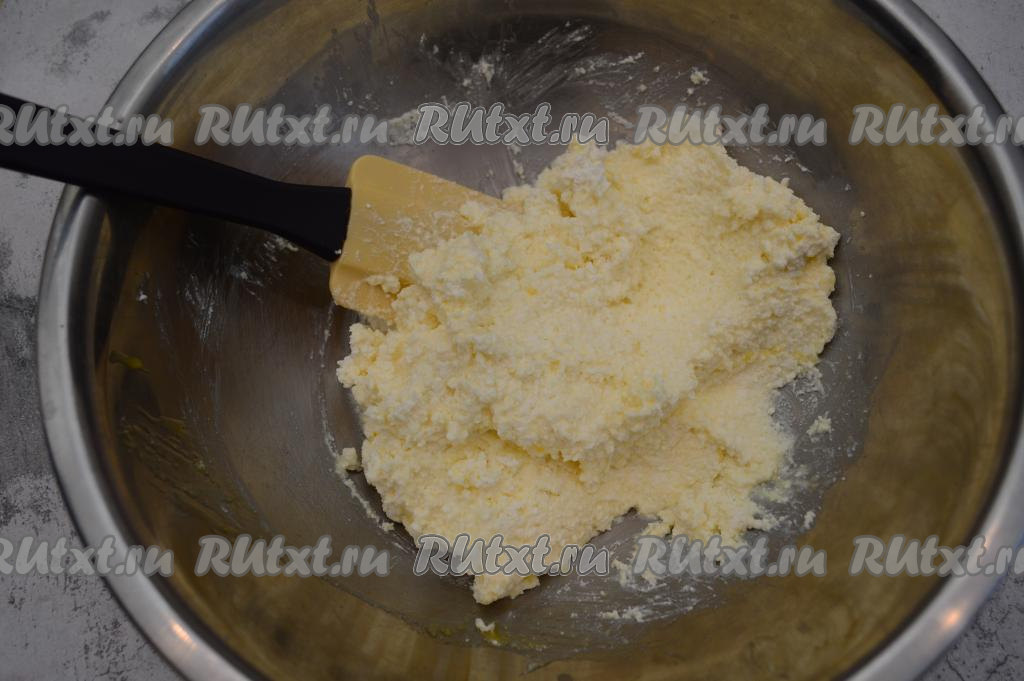 Перемешать силиконовой лопаткой (или вилкой) до получения однородной творожно-желтковой массы.