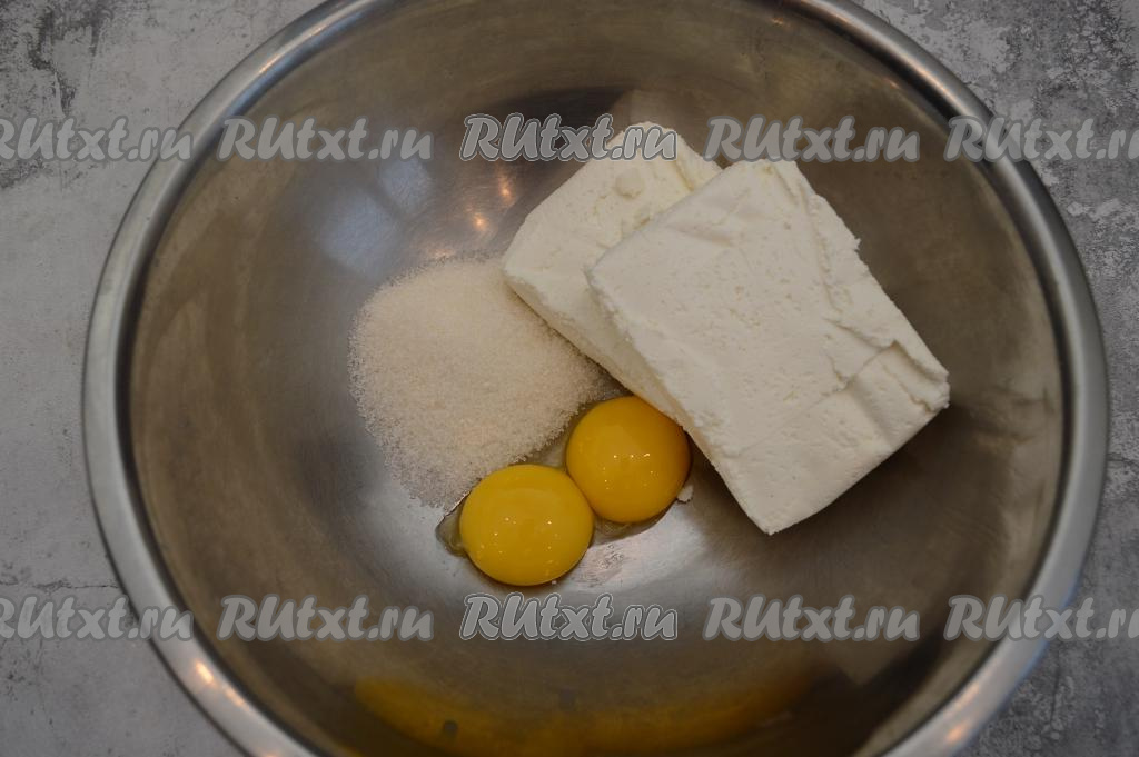 В глубокую миску выложить желтки, творог и сахар.
