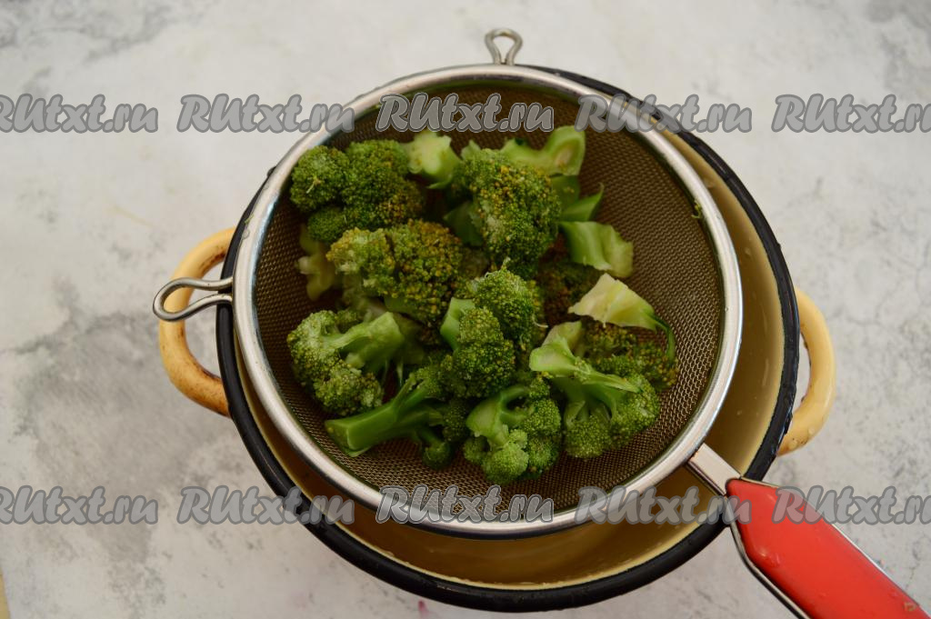 Откинуть отваренную брокколи на сито, чтобы стекла вся вода. Дать капусте немного остыть.