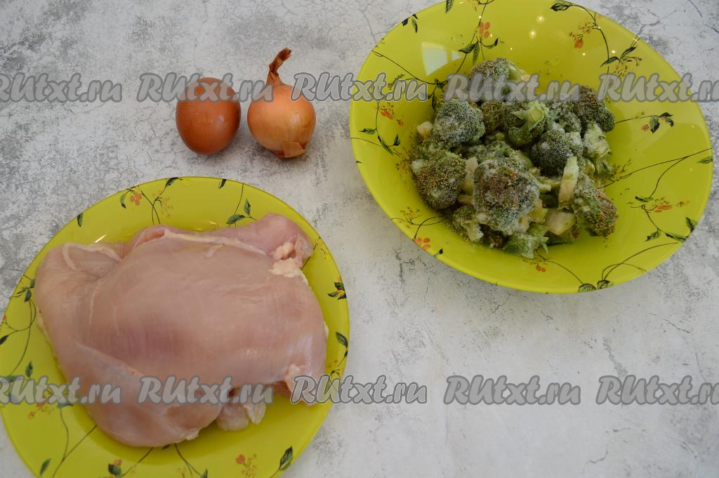 Лук очистить. Пропустить через мясорубку кусочки куриного мяса, лук и варёную брокколи в глубокую миску, добавить сырое яйцо.