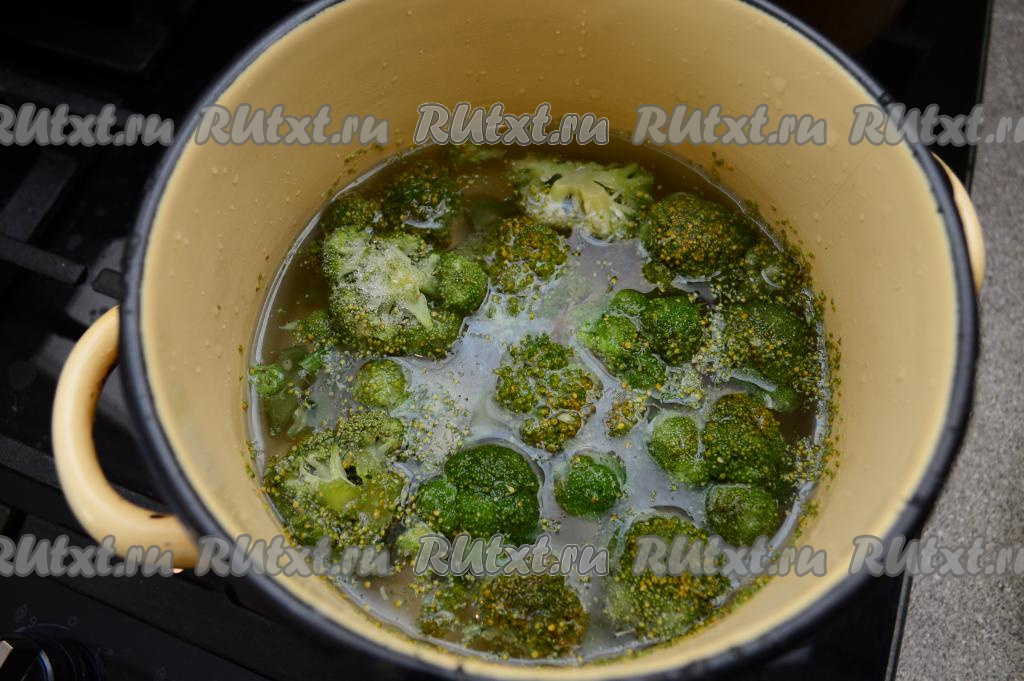 Соцветия свежей или замороженной (не отваренной перед заморозкой) брокколи выложить в кастрюлю, полностью залить водой, поставить на огонь. А после закипания отварить капусту на небольшом огне в течение 5 минут (до мягкости). Если же вы взяли брокколи, которая была отварена перед заморозкой, тогда просто разморозьте её, ещё раз отваривать её не нужно.