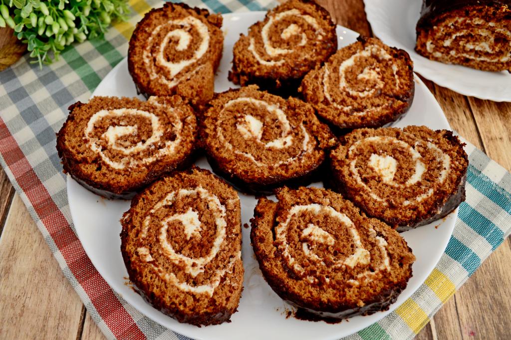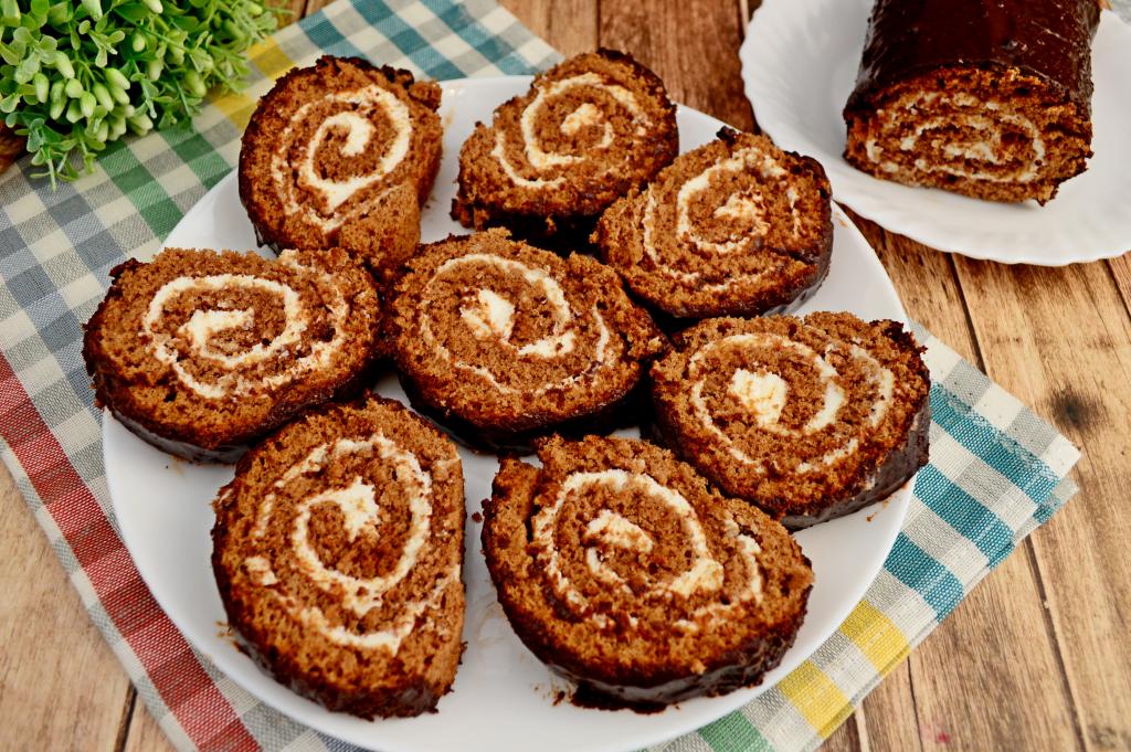 А затем вкусный, аппетитный шоколадный рулет с нежнейшей творожной начинкой нарезать на кусочки и подать к семейному чаепитию или праздничному столу.