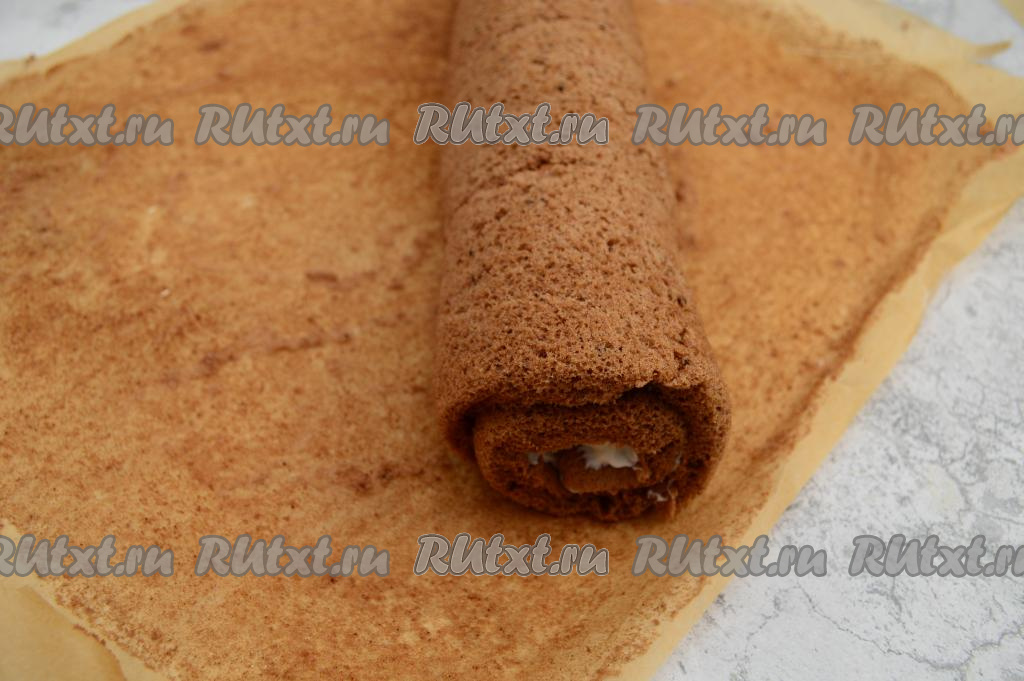 Готовому бисквиту дать остыть в течение 1-2 минут. Затем сразу вместе с бумагой, на которой он выпекался, свернуть горячий корж в рулет, начиная с узкой стороны. Сразу завернуть шоколадный рулет в тканевое полотенце и оставить остывать при комнатной температуре на 40-60 минут. За это время бисквит полностью остынет и станет более мягким.