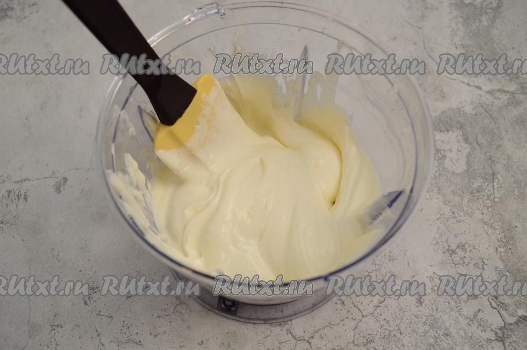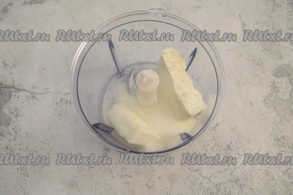 Пробить творог с сахаром в измельчителе в однородную массу (без комочков). Если нет измельчителя, тогда можно пробить творог с сахаром до однородности погружным блендером (или перетереть творог через сито, а затем смешать с сахаром).