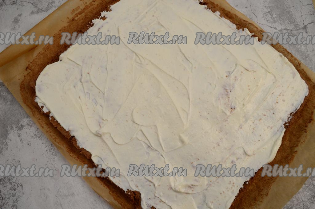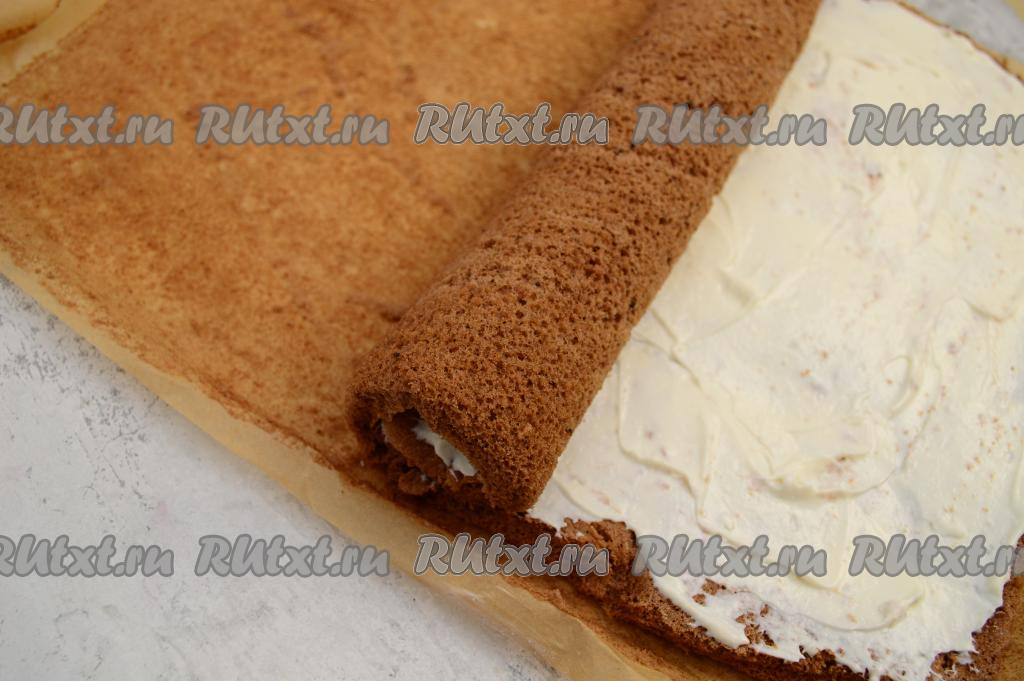 Развернуть шоколадный рулет, отделить от бумаги. Равномерно смазать корж с одной стороны творожным кремом.