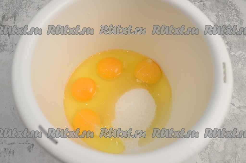 Взбить яйца с сахаром в течение 7 минут миксером на максимальных оборотах.