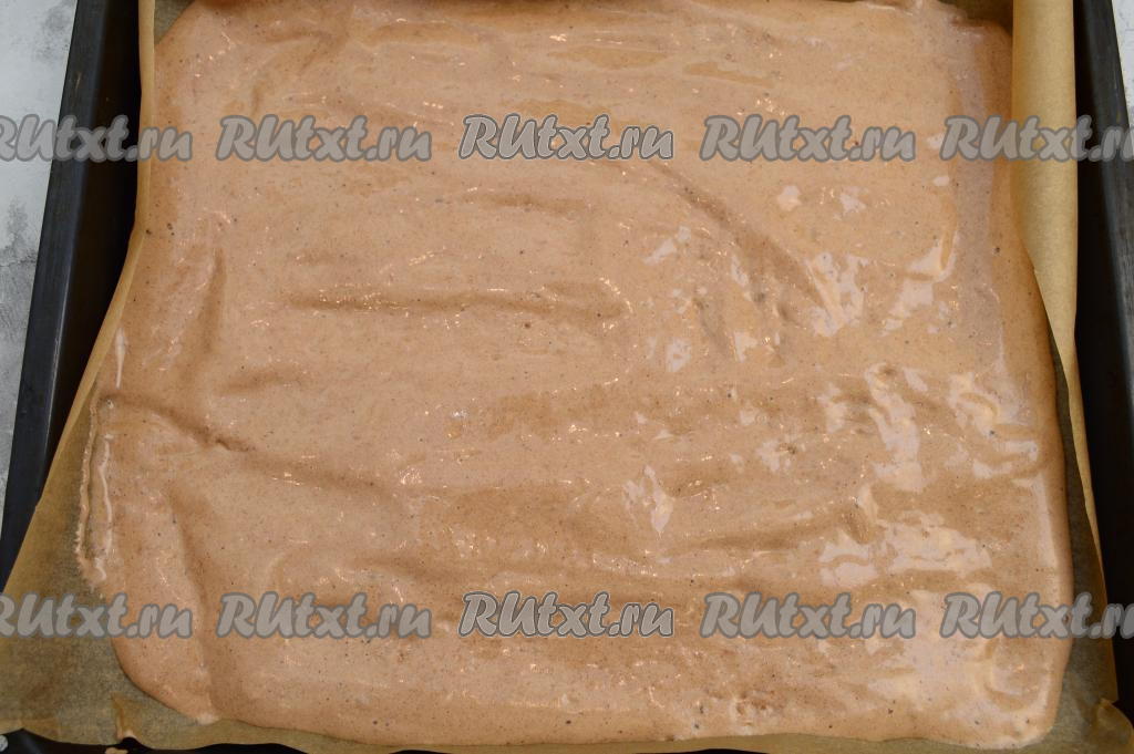Противень (я использовала противень размером 30х40 сантиметров) застелить пергаментом (или силиконовым ковриком). На застеленный противень вылить тесто, разровнять его силиконовой лопаткой.