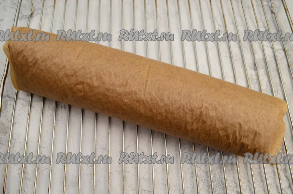 Рулет завернуть в пергамент и отправить в холодильник минимум на 2-3 часа (я оставляю на ночь), чтобы бисквит пропитался.