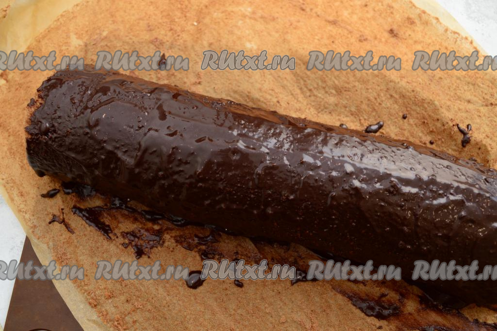 Пока глазурь горячая, нанести её на поверхность нашего рулета. Убрать рулет в холодильник минут на 40 (до застывания глазури).